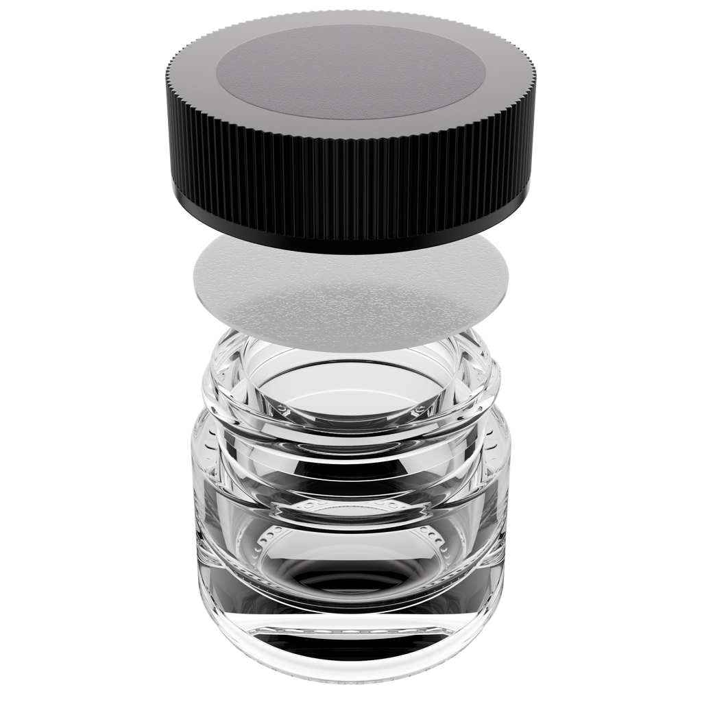 5ML clear glass concentrate container with black cap. This container is the industry standard for glass concentrates. The cap is a simple screw top mechanism. Our glass is the best in the industry. It's ultra clear and very thick!