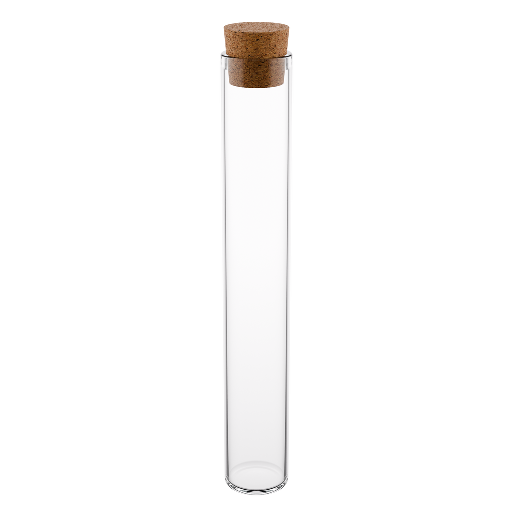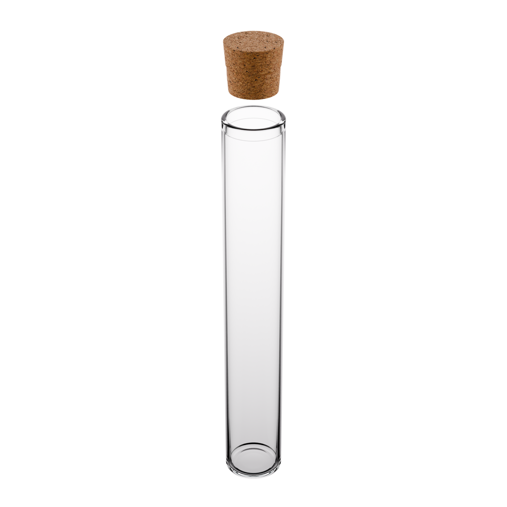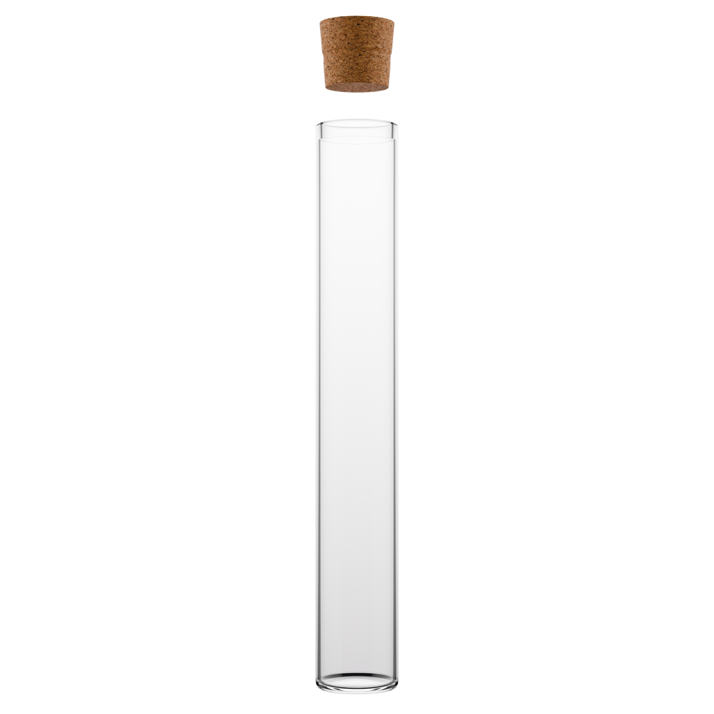 Our Pre-Roll ultra clear glass tubes have a straight wall and thick glass. Each tube comes with a cork top that keeps the product fresh inside and is a sustainable solution for pre roll packaging. This is the perfect container for single large pre-rolled products. The container has nearly zero taper, which makes it much better for custom labels and other branding solutions.