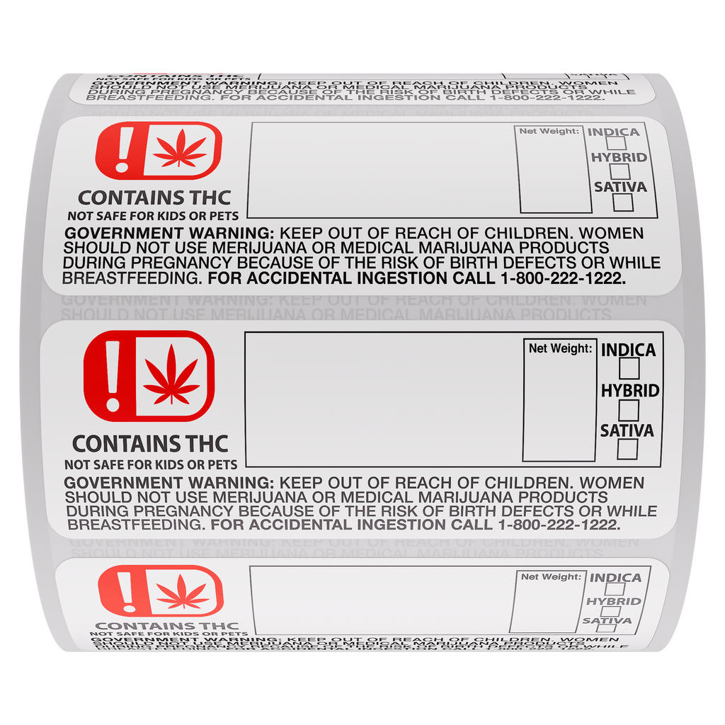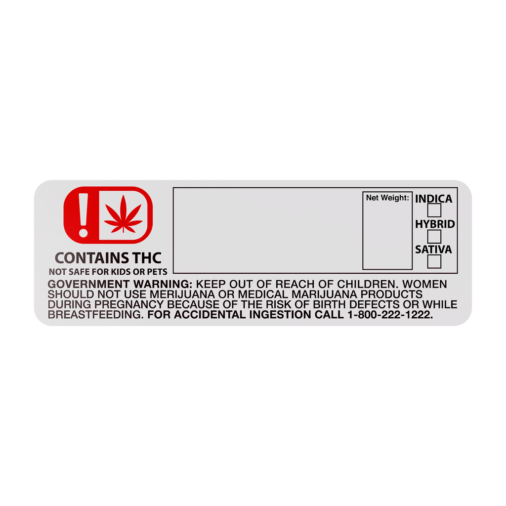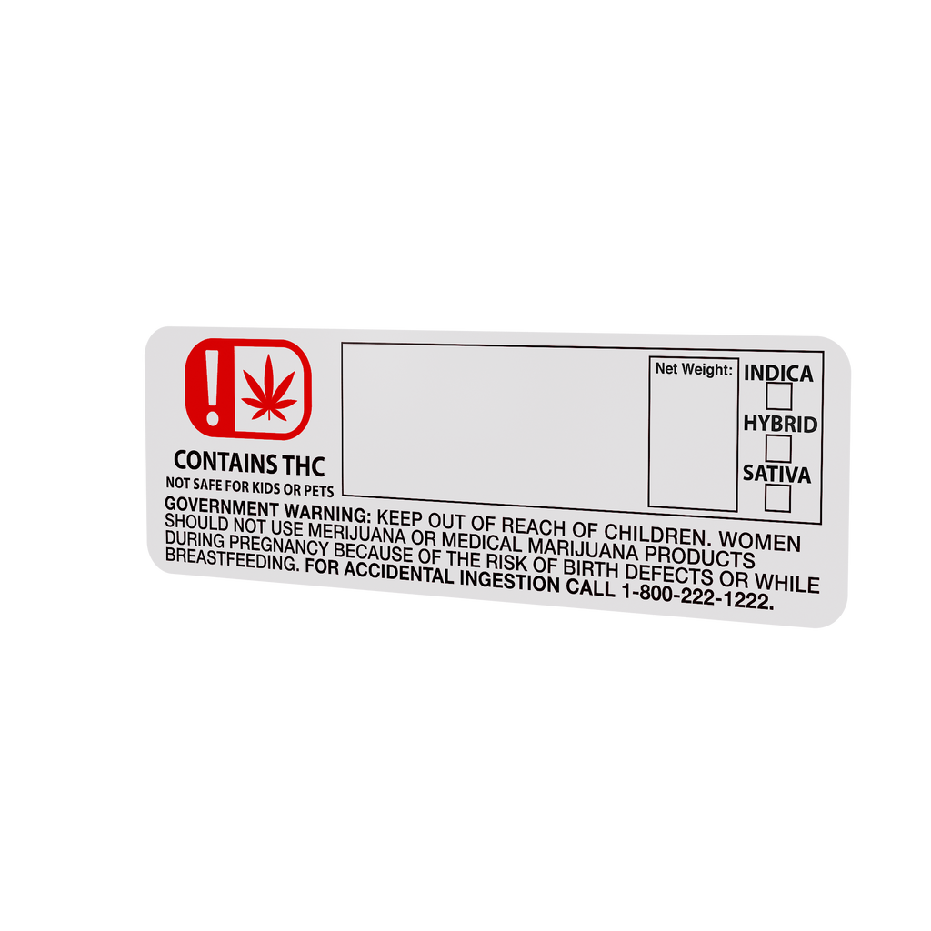 Our labels fit all popular containers (squeeze tops, pop top bottles, glass jars, reversible cap jars, bags, and more). Premium Cannabis Strain and Identification labels. Our labels are made in the USA using quality raw materials and superior printing process. They feature a strong permanent adhesive, crisp print with current formal regulation imagery and a semi gloss finish for easy writing. Safely identify your product using our premium US made Cannabis labels. Dimensions: 3"x1.25"